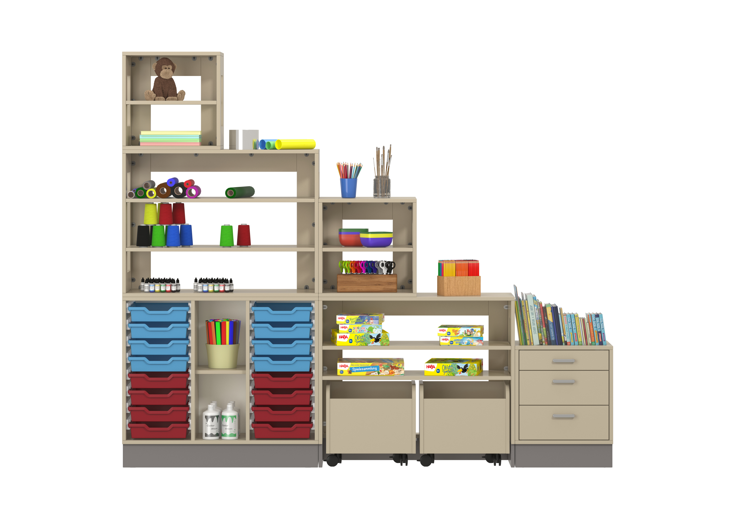 Papier, pennen, spelletjes, boeken, kleuren, poppen, kussens, bouwblokken, knutselmateriaal... Alles wat belangrijk is voor het dagelijks leven in het kinderdagverblijf heeft hier zijn plek. Netjes georganiseerd en toegankelijk voor de kinderen. Let op: De kastcombinatie kan worden gebruikt als kamerscherm, maar moet aan één kant aan de muur worden bevestigd om omvallen te voorkomen.Bestel materiaaldozen apart. Decoratie niet inbegrepen. Materiaal: Spaanplaat decor beach beige. Afmetingen: B 250 x H 146,5 x D 42 cm.