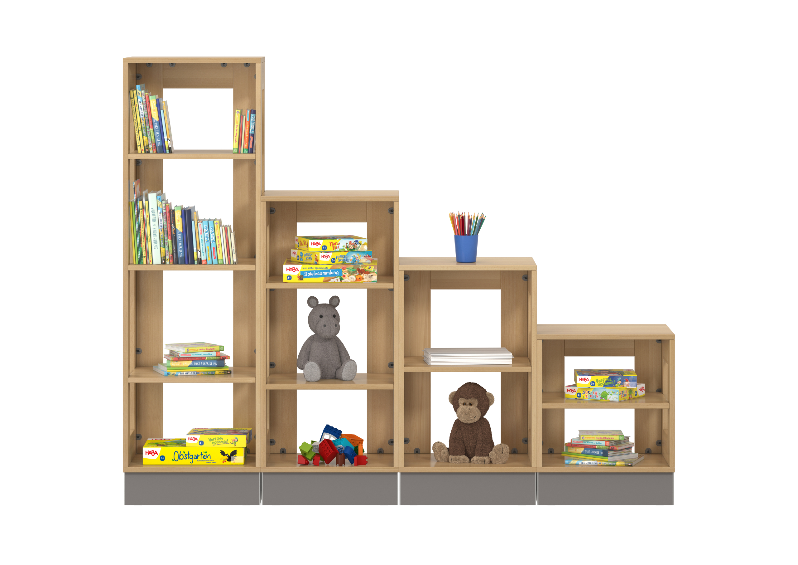 Deze kasten verdelen je groepsruimte op een zinvolle manier in verschillende speel- en knutselzones. En omdat het rekken zijn, kun je altijd zien wie zich waar bevindt. Let op: de kastcombinatie kan als roomdivider dienen, maar moet aan een zijwand worden bevestigd om omvallen te voorkomen. Decoratie niet inbegrepen. Materiaal: massief hout, beukenfineer. Afmetingen: B 200 x H 162,5 x D 42 cm.