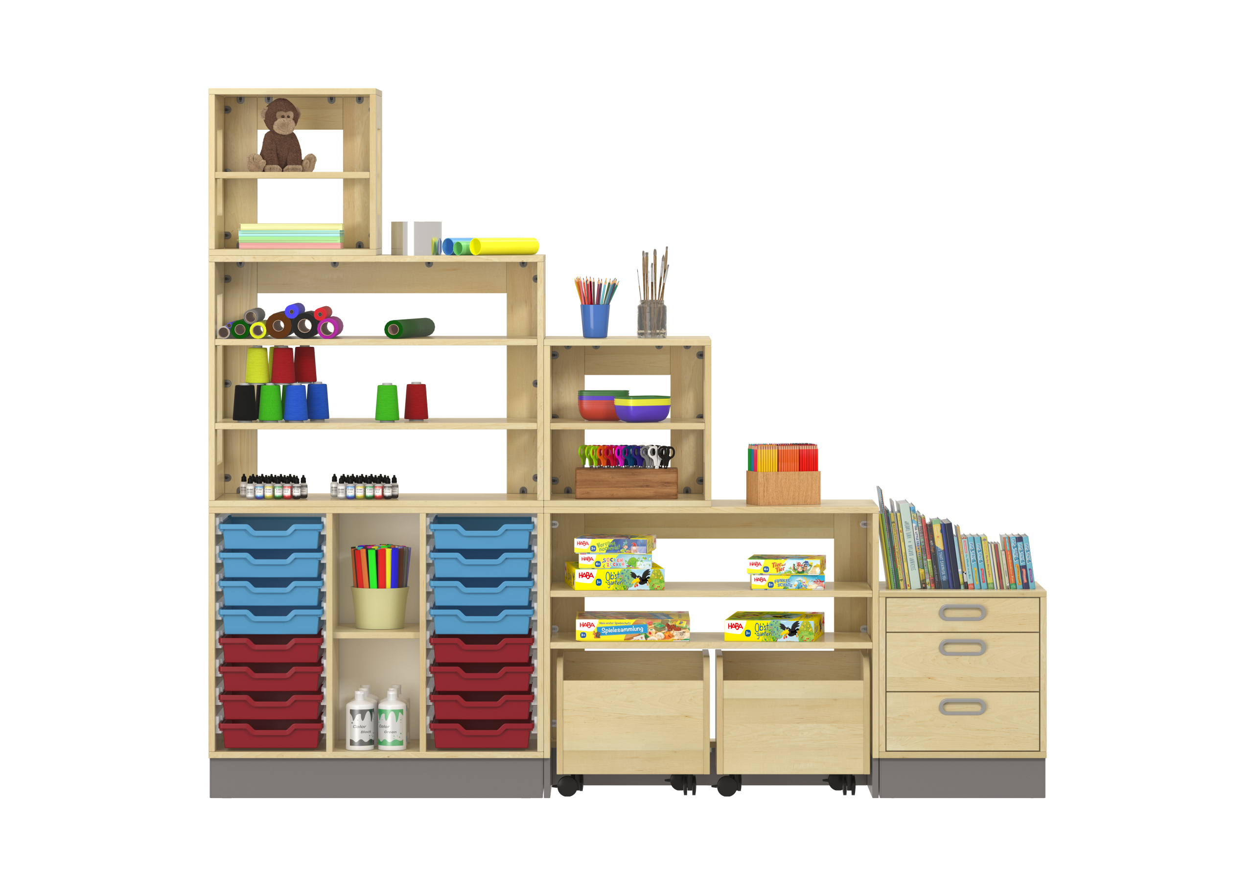 Hier vindt alles zijn plaats wat belangrijk is in het dagelijks leven van een kinderdagverblijf. Netjes opgeruimd en toegankelijk voor de kinderen. Let op: de kastcombinatie kan als kamerscherm dienen, maar moet aan de korte zijde aan de muur worden bevestigd en daarmee tegen omvallen beveiligd worden. Materialenbakken afzonderlijk bestellen. Decoratie niet inbegrepen. Materiaal: Massief hout, berkenfineer. Afmetingen (zonder sokkel): B 250 x H 146,5 x D 42 cm.
