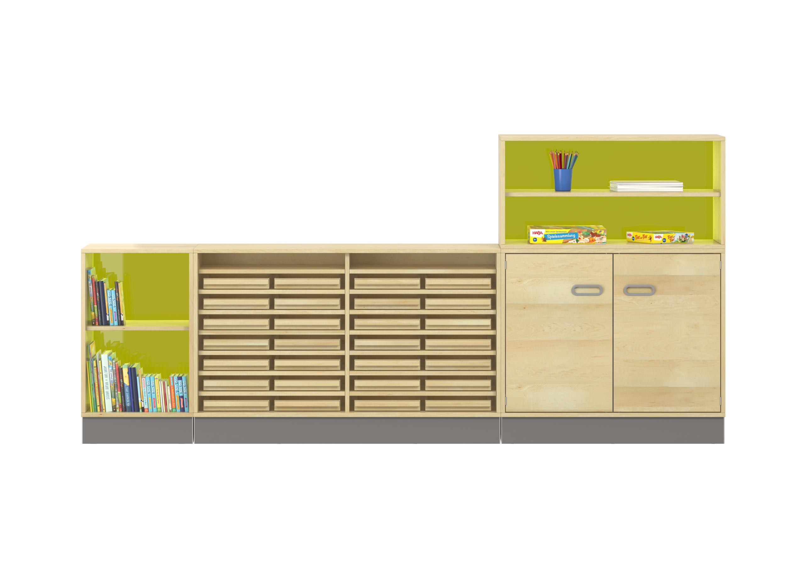 Ieder kind krijgt een eigen houten bak waarin kleine knutselwerkjes en tekeningen bewaard kunnen worden. Ook het knutselmateriaal vindt zijn plaats in deze kastcombinatie. Let op: de kastcombinatie kan als kamerscherm dienen, maar moet aan de korte zijde aan de muur worden bevestigd en daarmee tegen omvallen beveiligd worden. Decoratie niet inbegrepen. Materiaal: Massief hout, berkenfineer. Afmetingen: B 250 x H 137,5 x D 42 cm.