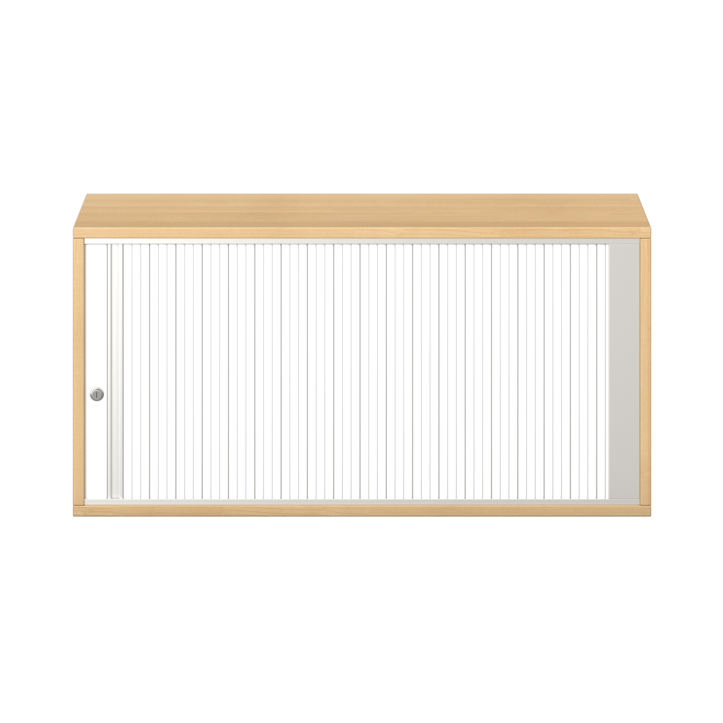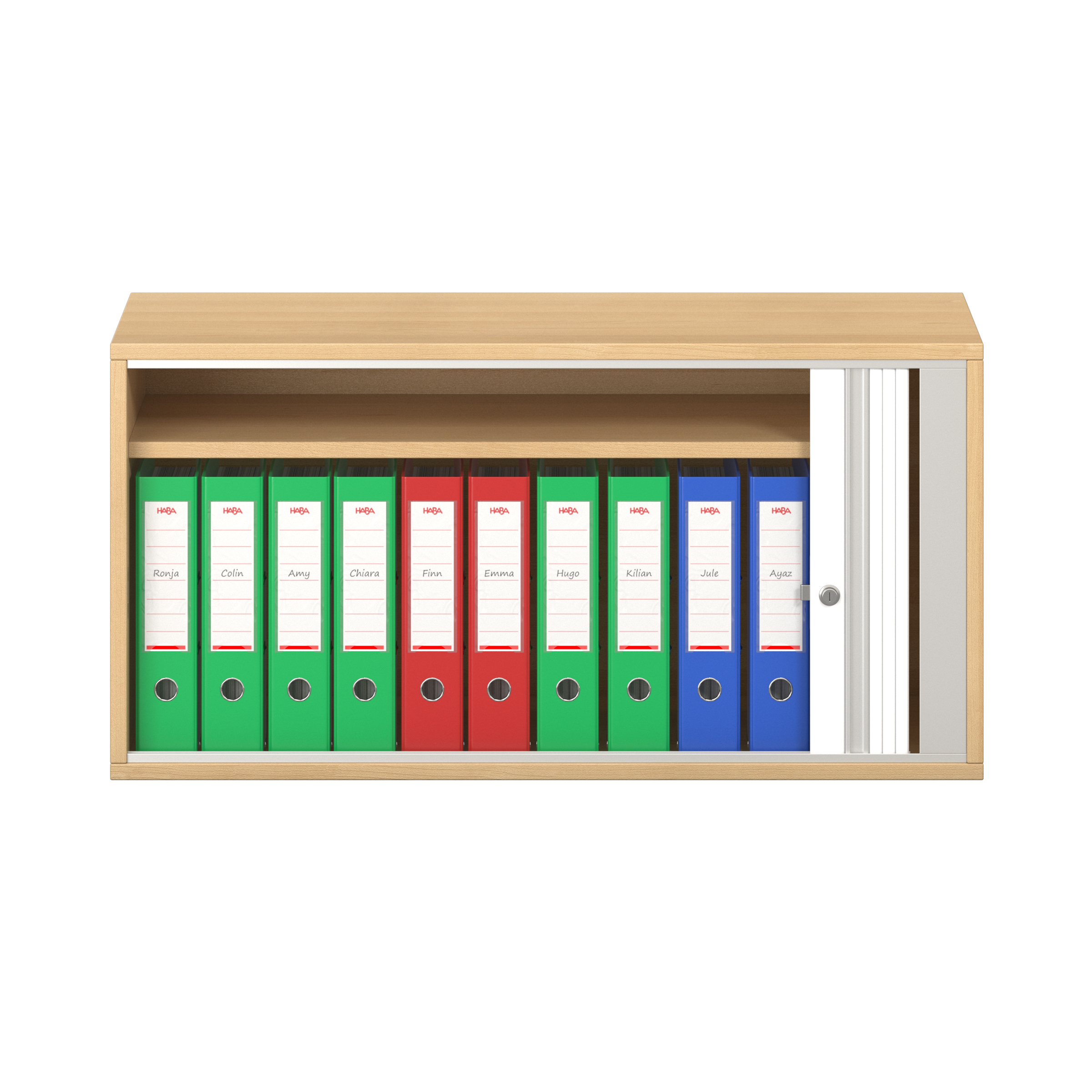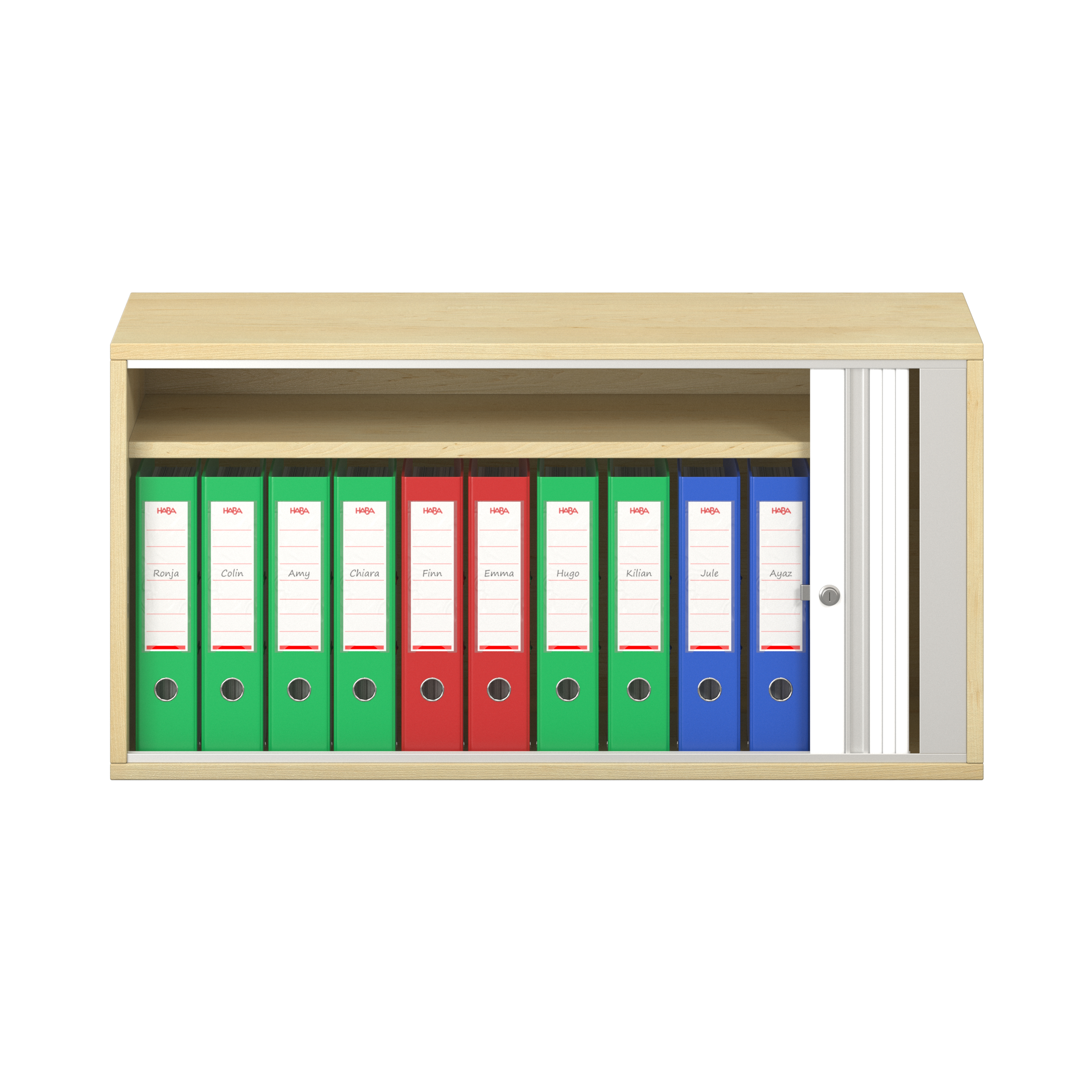 1 legplank. Afsluitbare horizontale rolluik met grepenlijst. Voor 10 ordnermappen met een maximale breedte van 8 cm.