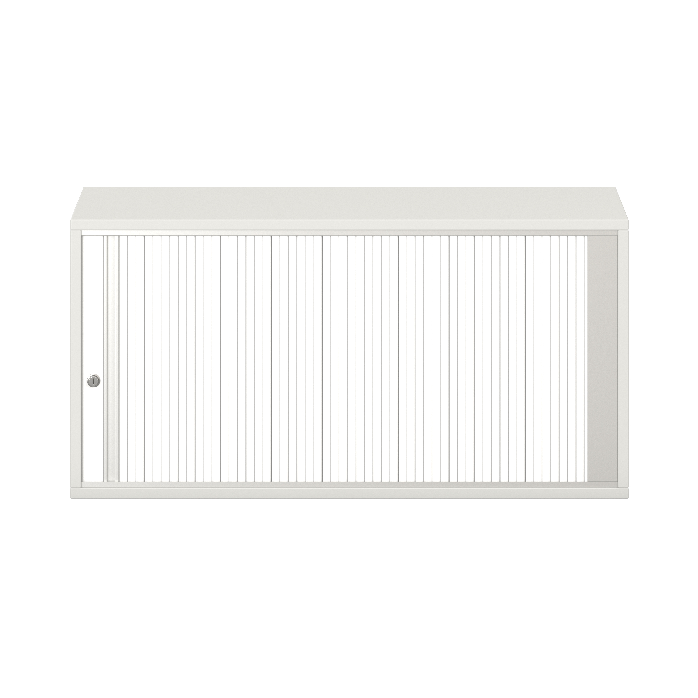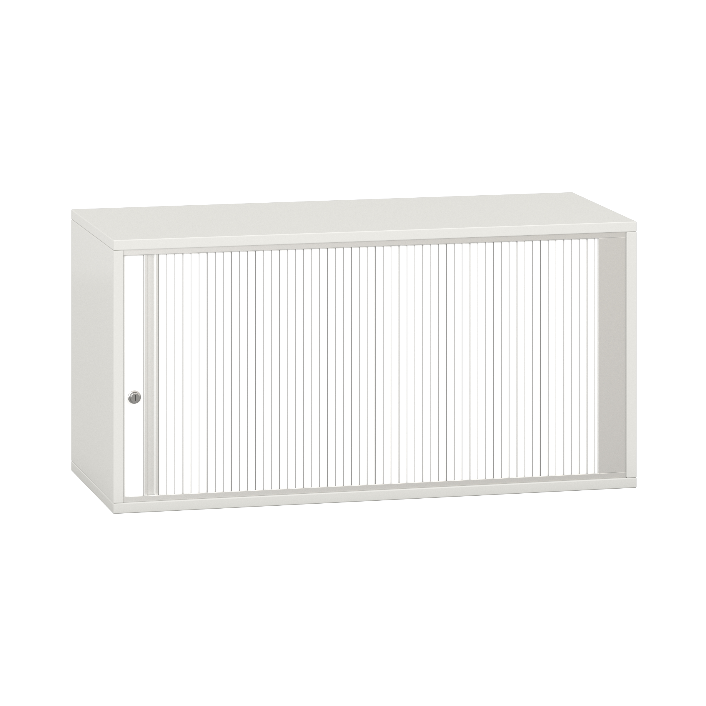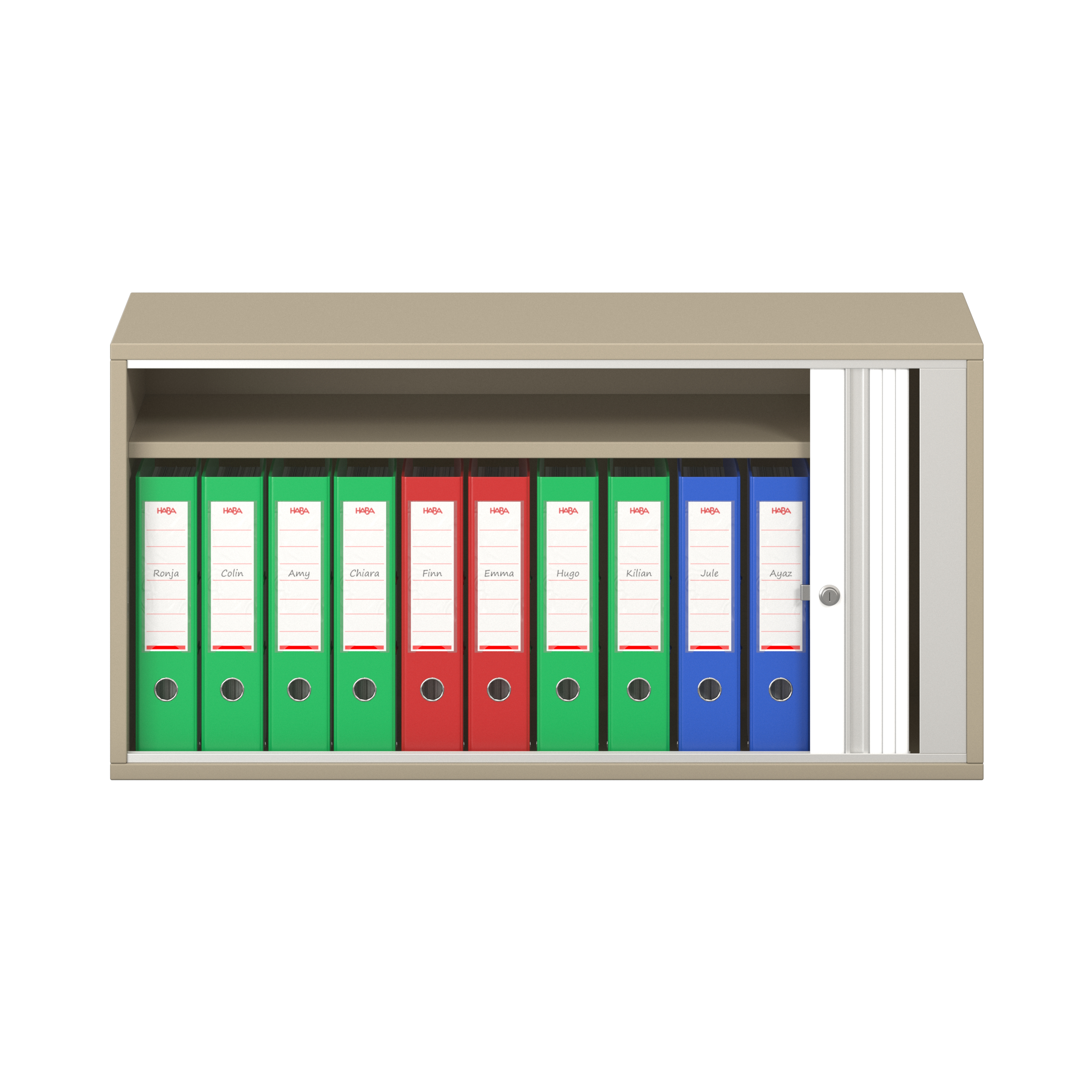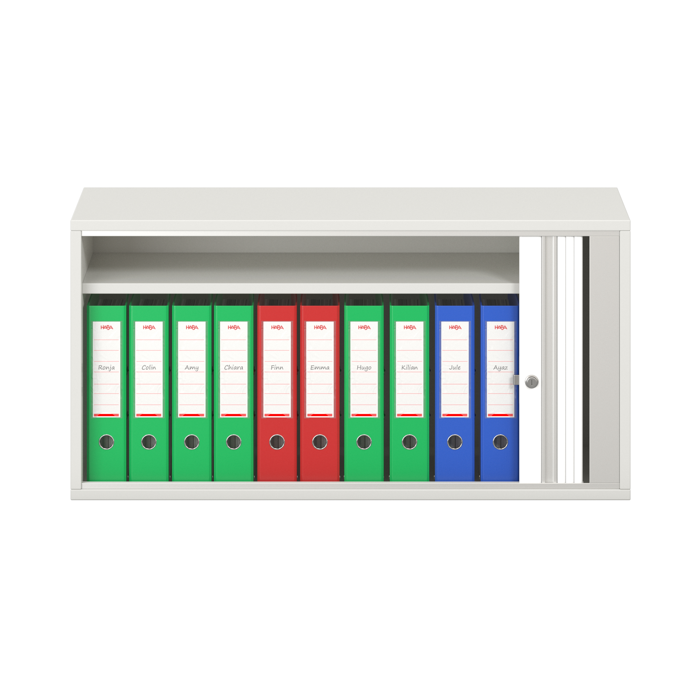 1 legplank. Afsluitbare horizontale rolluik met grepenlijst. Voor 10 ordnermappen met een maximale breedte van 8 cm.