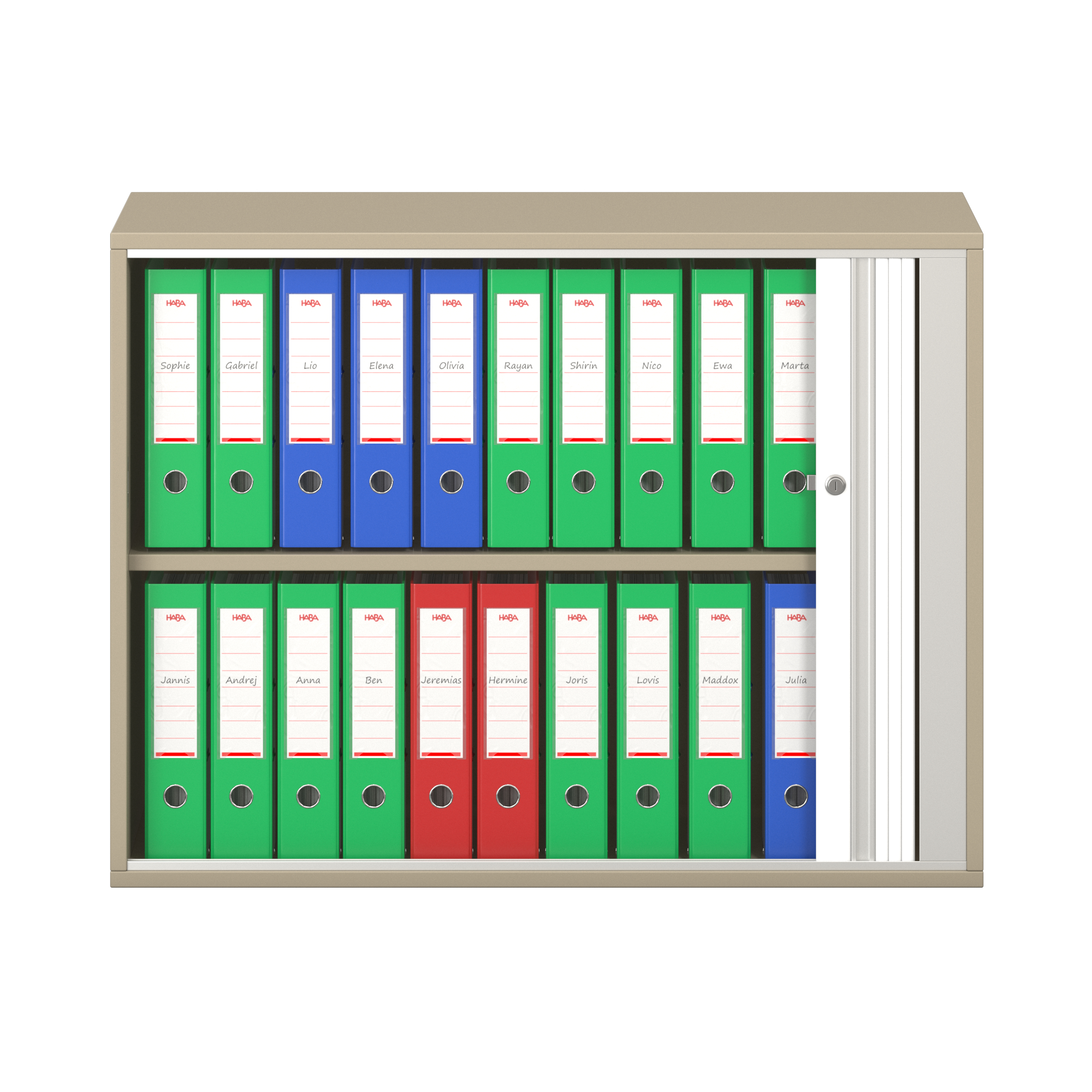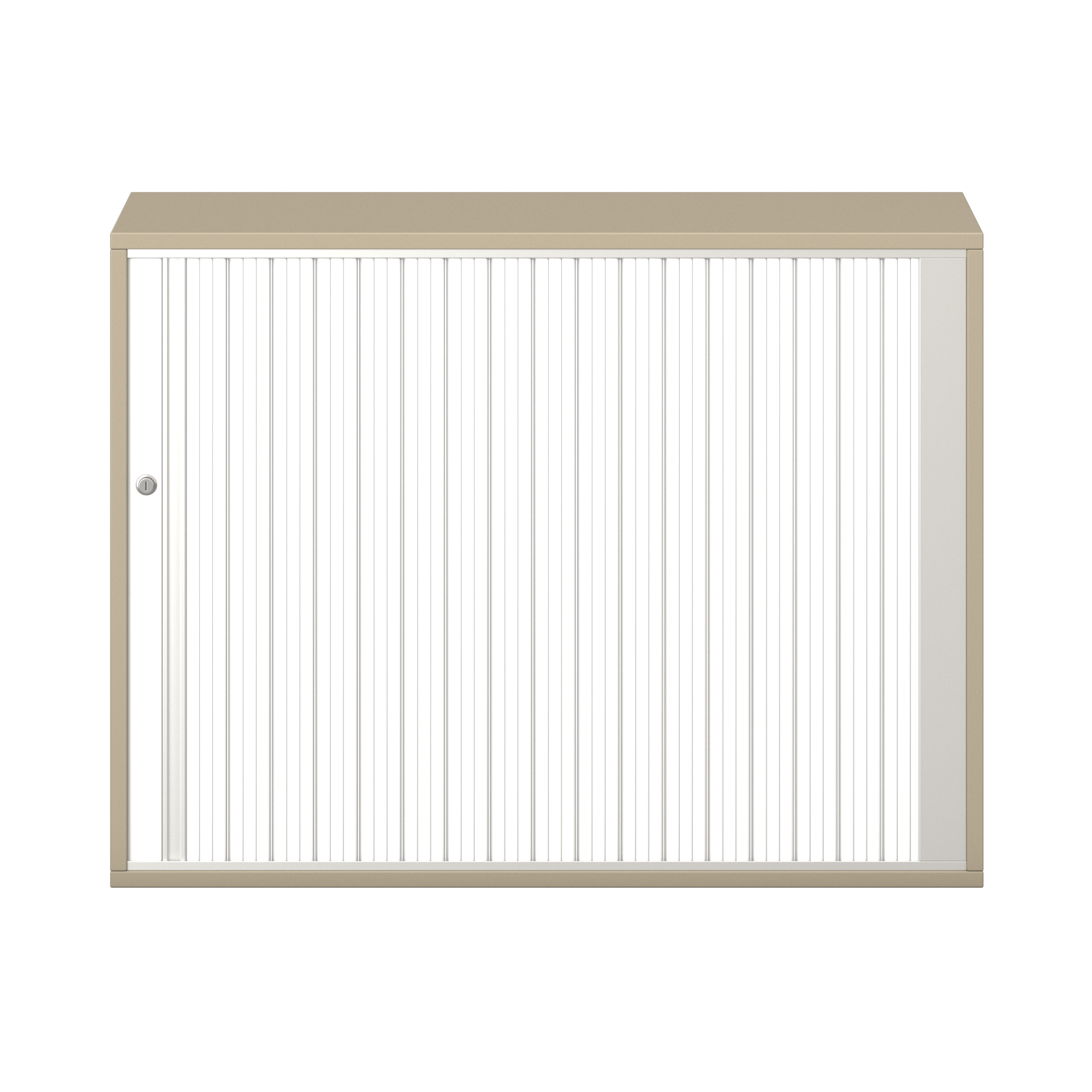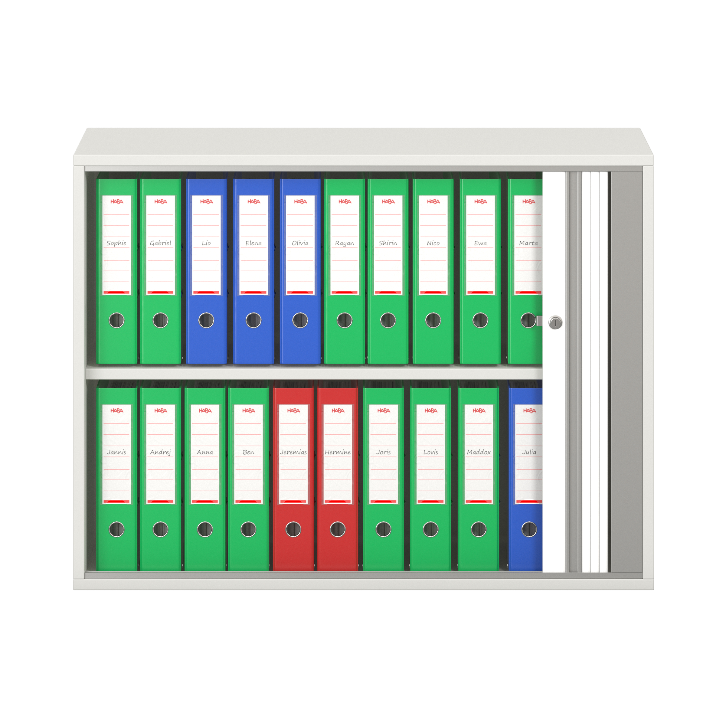 1 legplank. Afsluitbare horizontale rolluik met grepenlijst. Voor 10 ordnermappen met een maximale breedte van 8 cm.