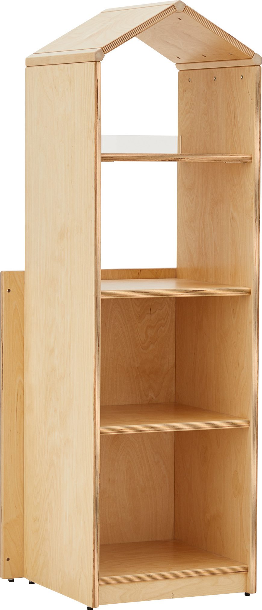 Smalle plank in de vorm van een huis met 4 vakken. Het bovenste vak heeft aan de achterkant een opstaande rand van acrylglas, de twee onderste vakken hebben een achterwand.