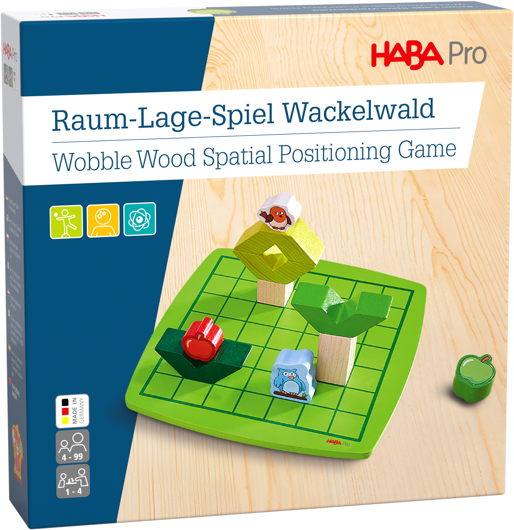 In het Wiebelig bos is er veel te doen: Aan de bomen groeien appels, een schattig egeltje staat eronder, terwijl de kleine uil zich achter een struik verstopt – of zou ze ervoor moeten staan? Bij het ruimte- en positioneringsspel moet je goed opletten, zodat aan het einde alle houten onderdelen op de juiste plaats liggen. Maar pas op: wanneer de wankellens in het spel is, valt alles snel om. Materiaal: Beukenhout, multiplex, karton, katoen. Speelbordafmetingen: 25,8 x 25,8 cm. Spelers: 1 - 4. Leeftijd: vanaf 4 jaar.