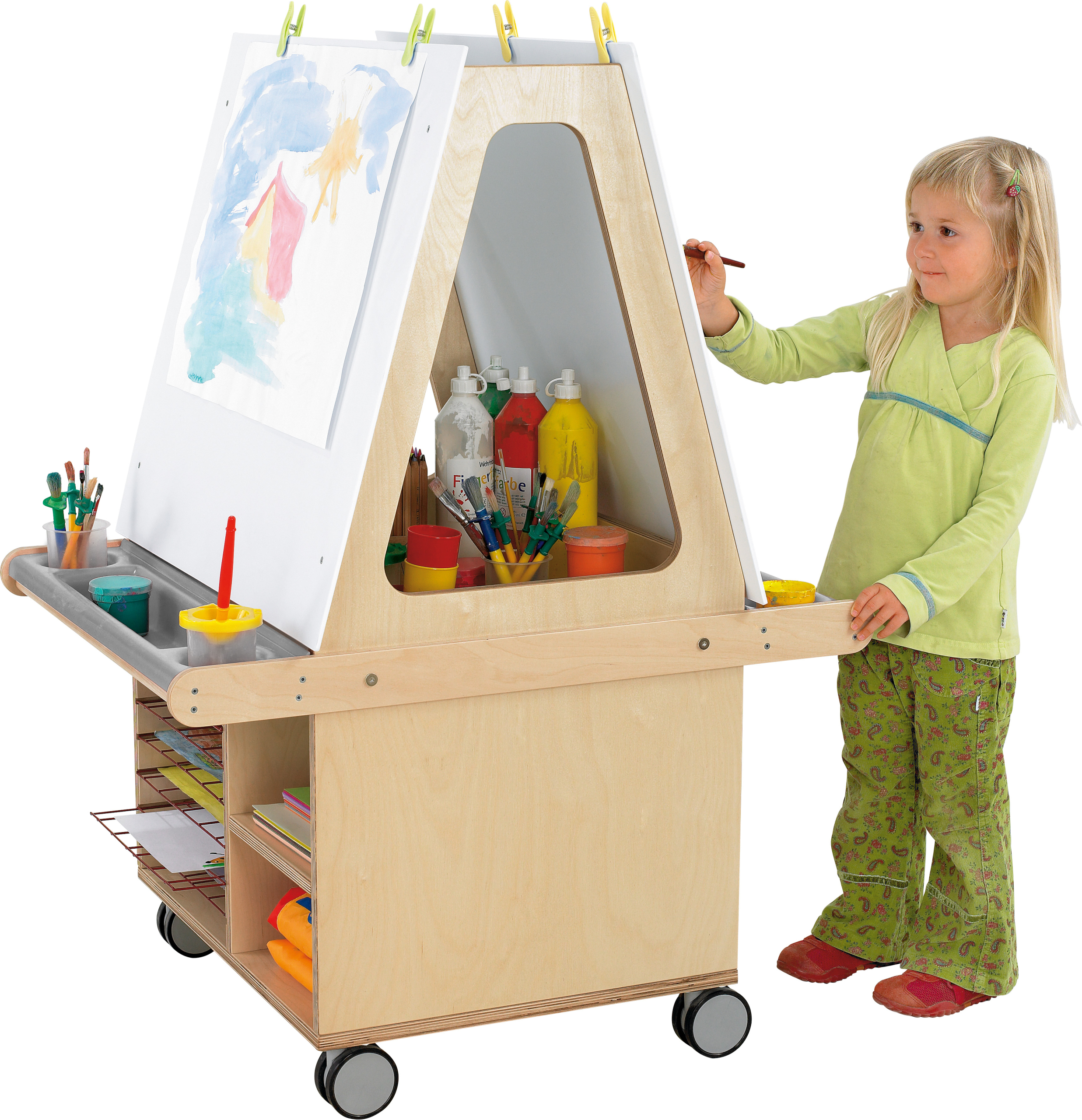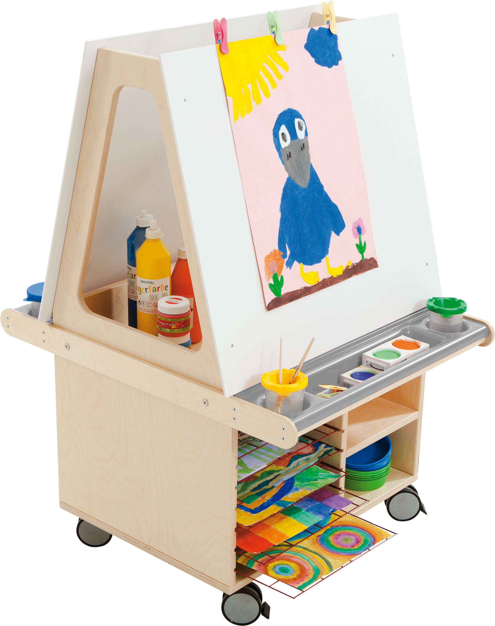 Het mobiele centrum is zowel een schildersezel als een droogwagen in één. Het biedt ruimte voor tekenpapier, droogroosters en een wit schilderoppervlak voor de kunstwerken. Twee kleine kunstenaars kunnen hier tegelijkertijd met de penseel aan de slag. De diepe lades bieden elke 2 bekers een veilige stand en ruimte voor penselen en dergelijke. Het zijrek heeft een inlegplank. Materiaal: massief hout, licht gefineerd, wit kunststof. Afmetingen: B 70 x H 113 x D 81,5 cm, schilderoppervlak 70 x 62 cm (tot DIN A2), werkhoogte: 55 cm. Leeftijd: vanaf 3 jaar.