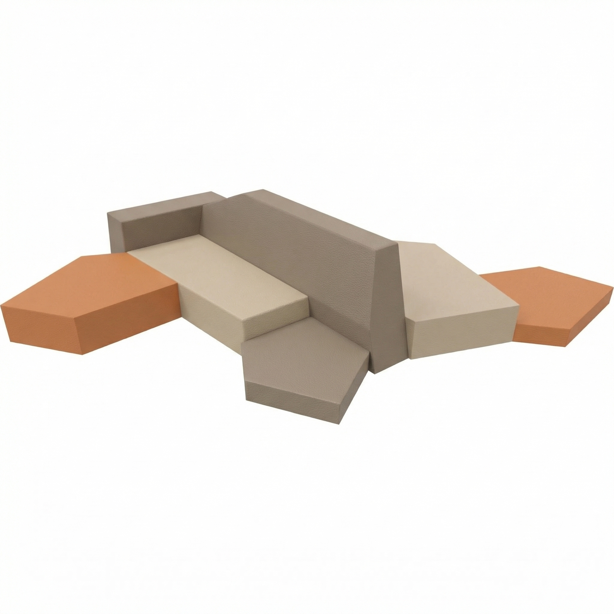 Bestaat uit de Ontdekker-sofa, Art.-Nr. 1158385, in Nogabruin/Jadegroen (CW52) en de podiums Art.-Nr. 1128585 in Jadegroen (CW50), Art.-Nr. 1128581 in Saffraangeel (CW10), Art.-Nr. 1128571 in Nogabruin (CW30) en Art.-Nr. 1128580 in Saffraangeel (CW10). Stof: CanvasBione Soft. Ruimtebehoefte: ca. 258 x 264 cm.