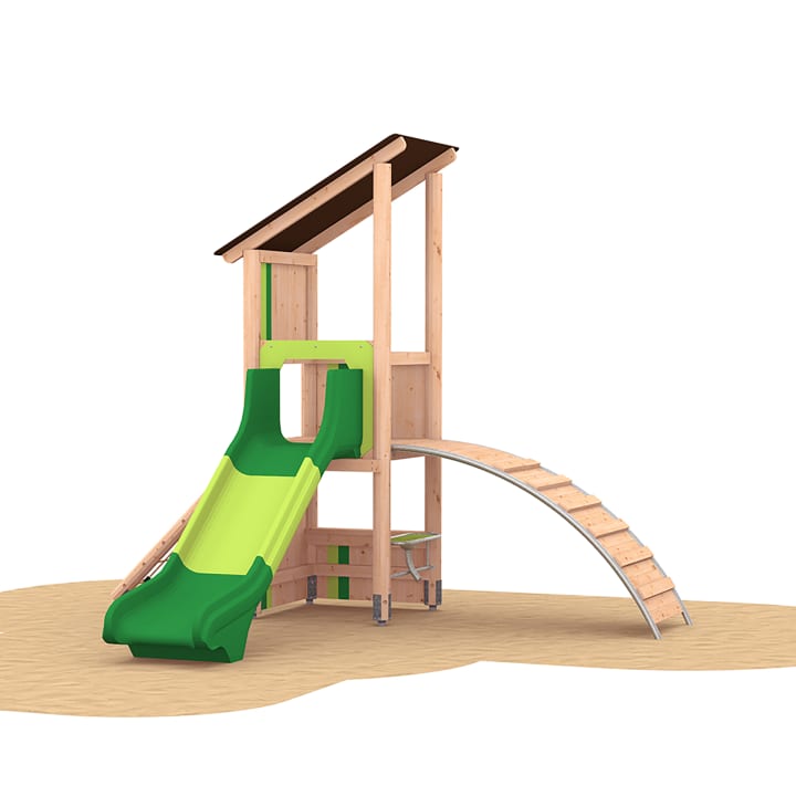 Bestaat uit: 1 vierkante toren, 1 glijbaan, 1 schuine netopgang, 1 boogopgang, 1 zandhut.