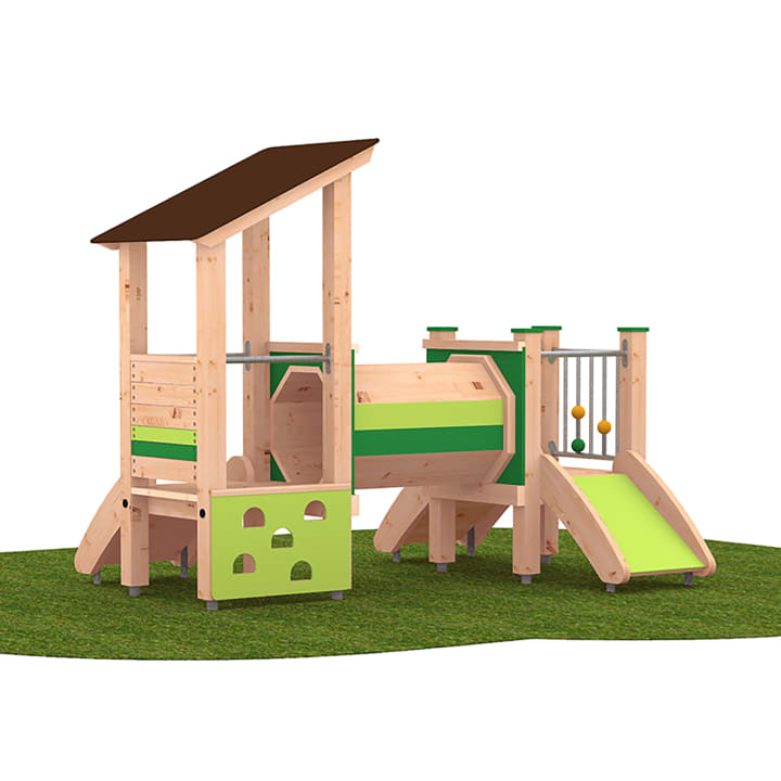 Deze installatie, gemaakt van hoogwaardige en onschadelijke materialen, biedt de kleintjes verschillende speelmogelijkheden en ontdekkingsplezier. De verschillende moeilijkheidsgraden geven kinderen de ruimte om hun grenzen te leren kennen, uit te proberen en hun zintuigen te scherpen. Bestaat uit: toren met pultdak, platform, kruipbuis, klimplaat, glijplank, schuine klimopgang, klimopgang, balkenbalustrade met bar, balustrade met ballen en veer.