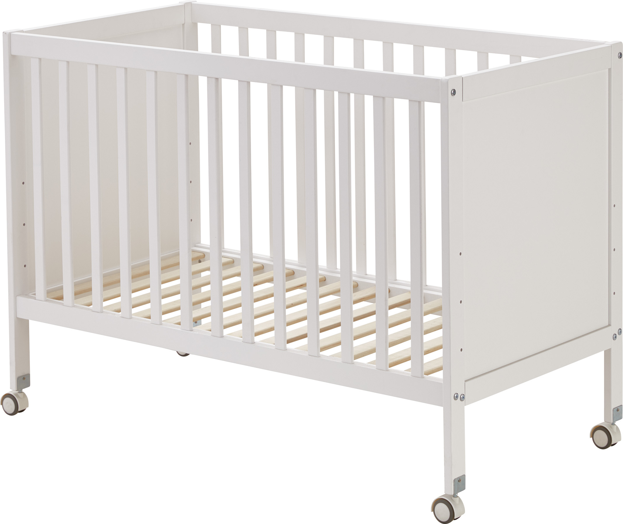 Ledikant met uitneembare spijlen, verstelbare lattenbodem en 4 kunststof wielen, waarvan 2 vergrendelbaar. Matras (artikelnr. 1180403) apart bestellen. Inclusief montage-instructies.