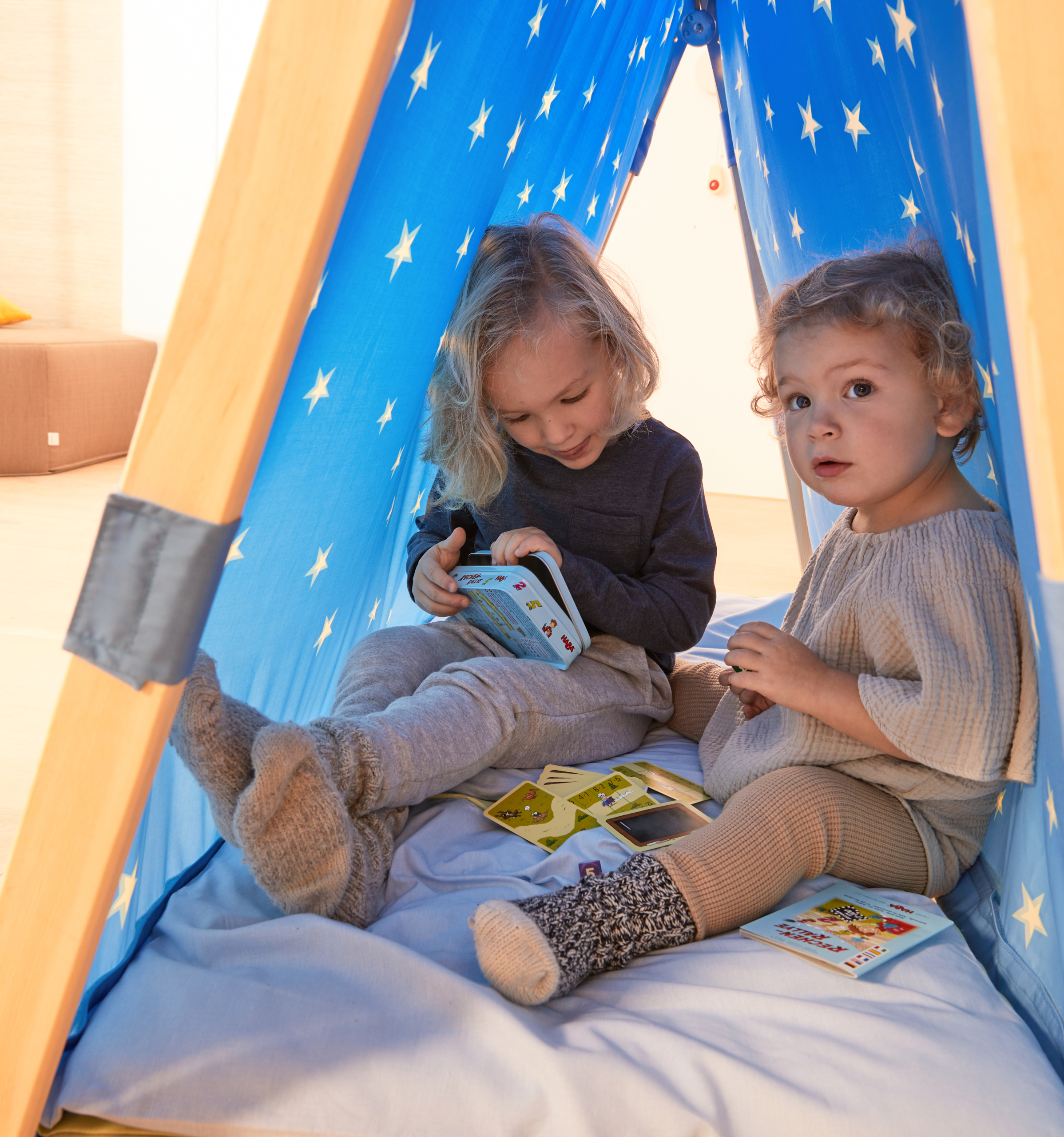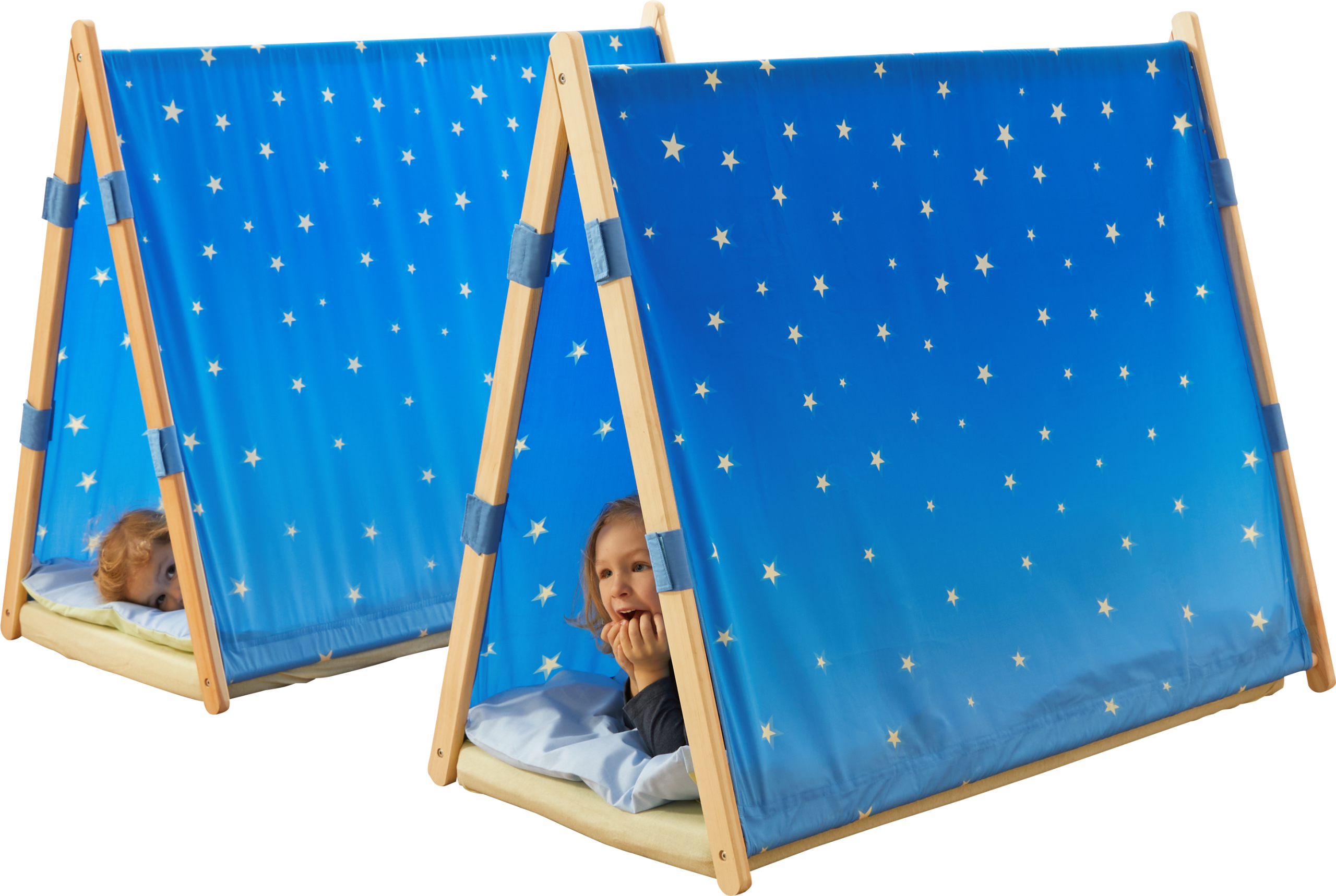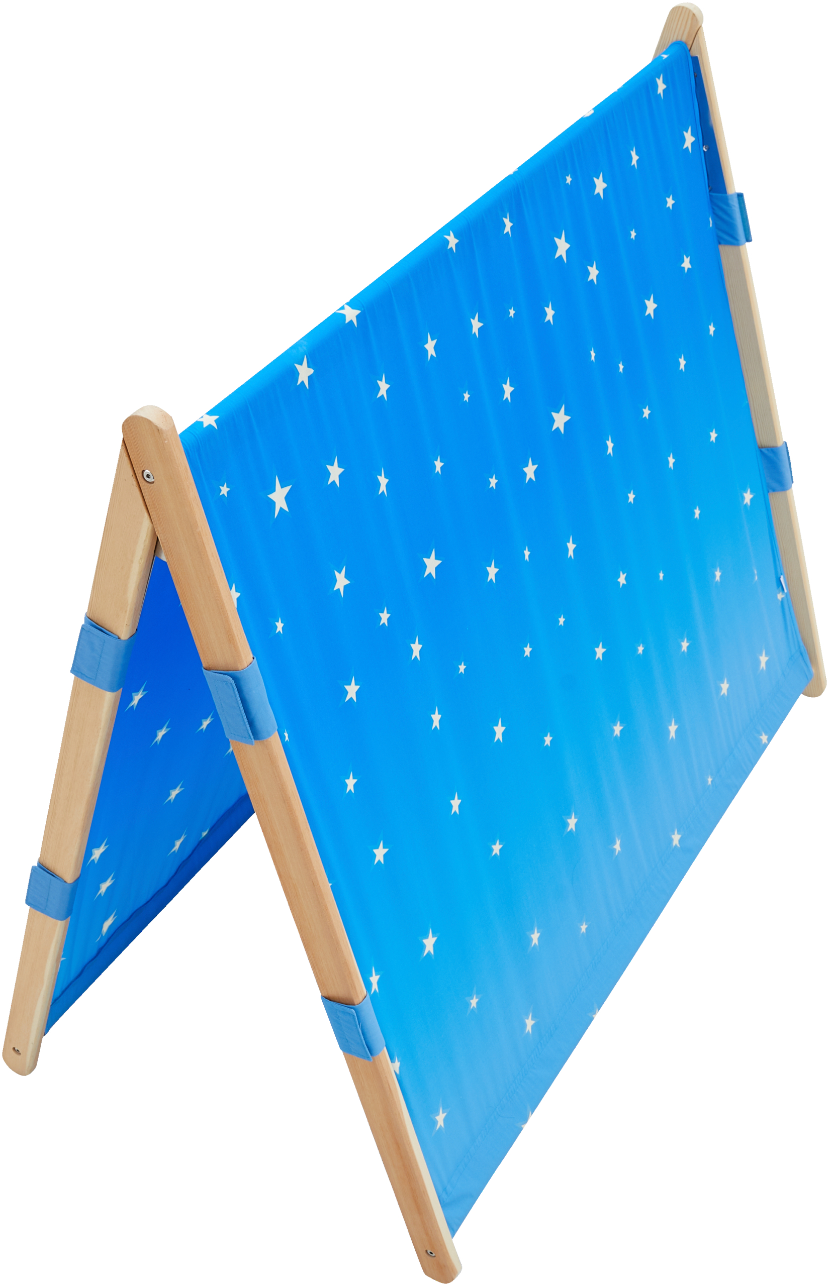 Het kleine tentje bestaat uit een houten frame en een stoffen dak met een sterrenhemeldesign. Het kan over alle ligkussens met een breedte van 54 cm geplaatst worden. Zo ontstaat er voor de kleintjes een rustruimte in de kamer, zodat ze ongestoorder (in) kunnen slapen. Materiaal: Dak van 100% polyester met klittenband voor bevestiging aan het frame van massief grenenhout. Afmetingen (opgebouwd): L 120 x B 64 x H 100 cm.