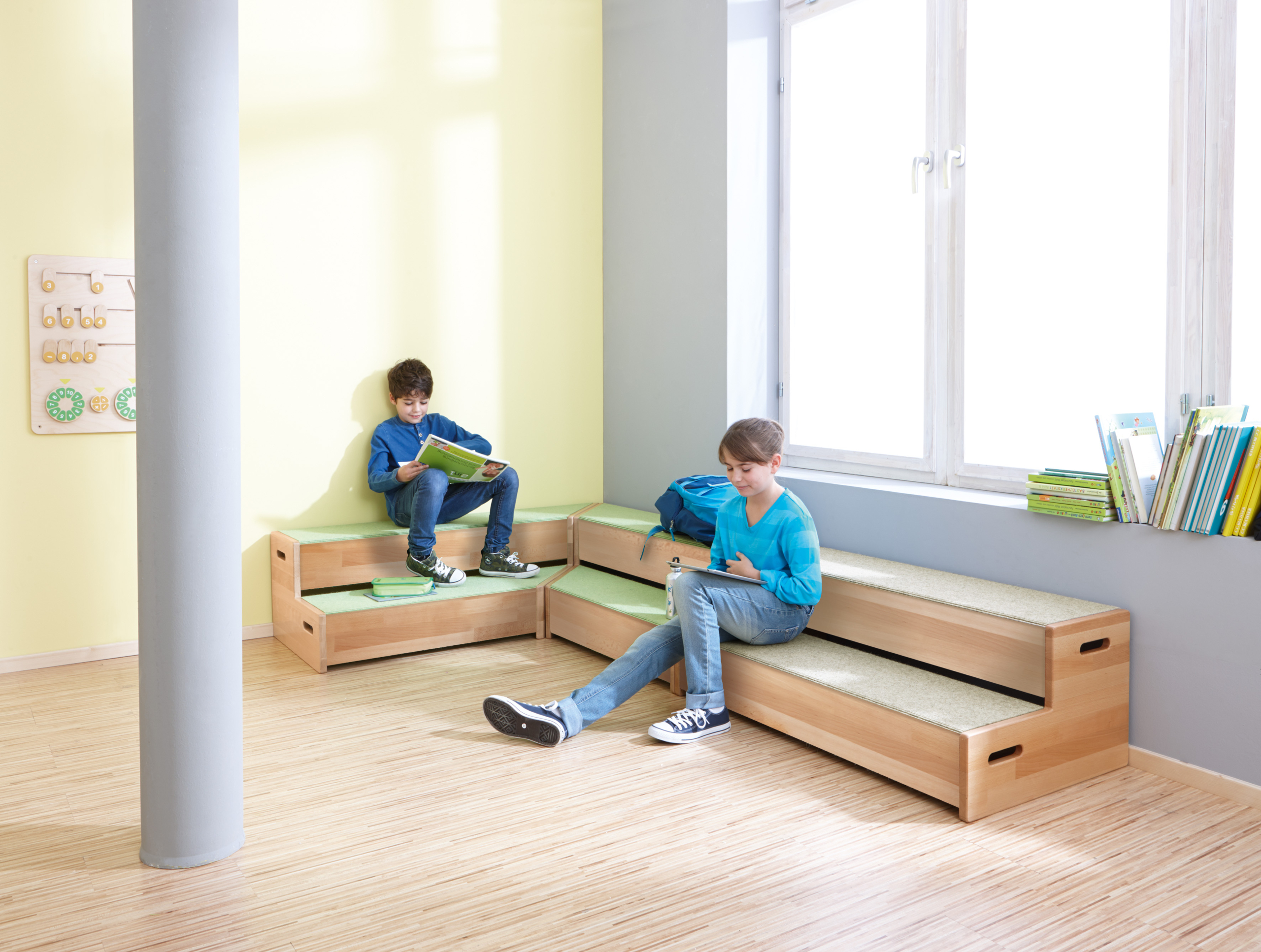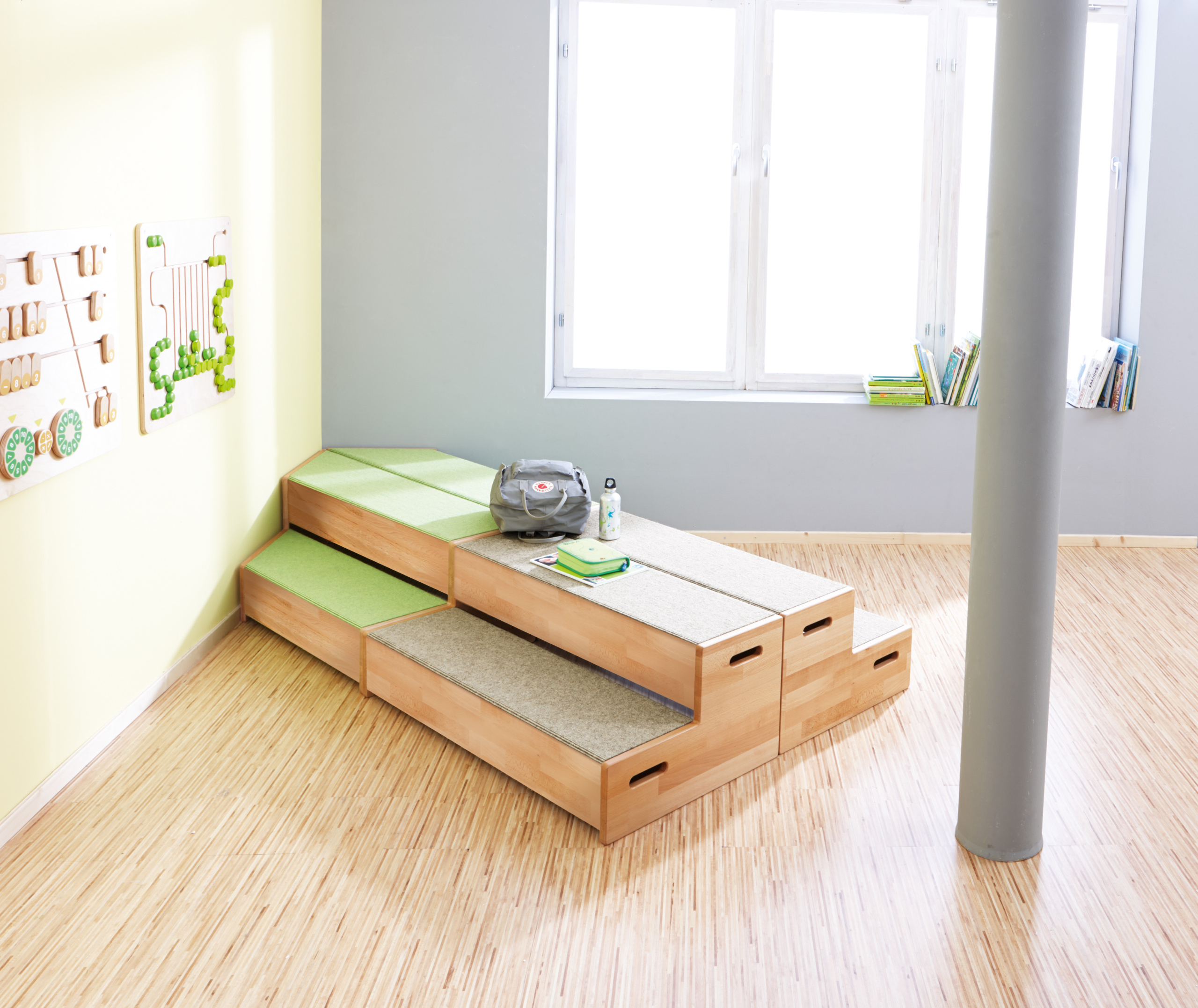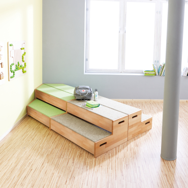 Met oppervlak van Tretford-tapijt. Materiaal: massief beukenhout. Veel toepassingsmogelijkheden, bijvoorbeeld als podium, zitplek of hoekbank.