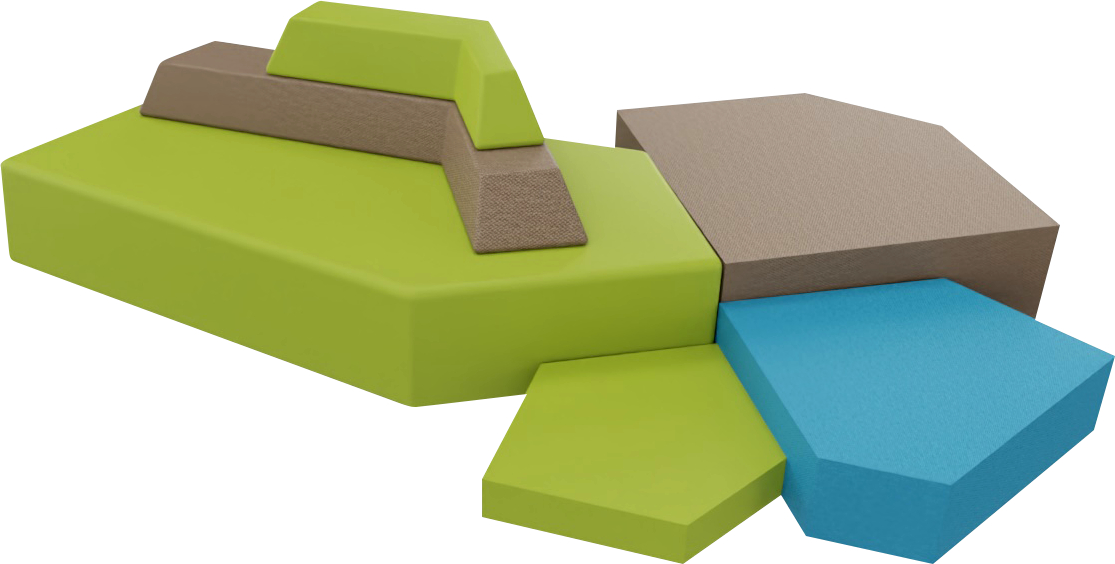 Bestaat uit een voorleesbank, art.nr. 379733, in nougatbruin/jadegroen (CW52), 1 podium, art.nr. 128577, in Nogabruin (CW30), H 33 cm; 1 podium, art.nr. 128581, in Noordsblauw (CW01), H 22 cm; 1 podium, art.nr. 128585, in Jadegroen (CW50), H 11 cm. Stof: CanvasBione. Benodigde ruimte: 295 x 205 cm.