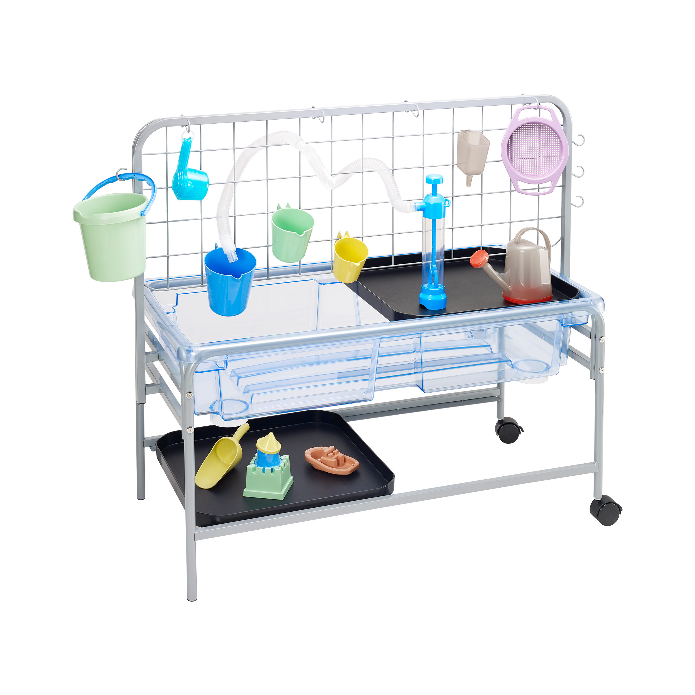 Het rooster dient als houder voor waterslangen. Drie zijhaken en vier dubbele haken over de volledige breedte van het rooster bieden veel ruimte voor emmers en andere speel- en experimenteerbenodigdheden. De groef langs de rand vangt overlopend water op, en de afvoerklep helpt bij het leegmaken. Dankzij het verrijdbare onderstel met twee vastzetbare wielen kan de speeltafel snel van plek worden veranderd. Tot het volgende gebruik kan een afdekplaat worden geplaatst. Materiaal: kunststof, metaal. Afmetingen: B 127 x H 58 x D 73 cm.