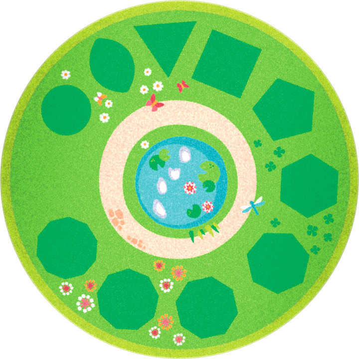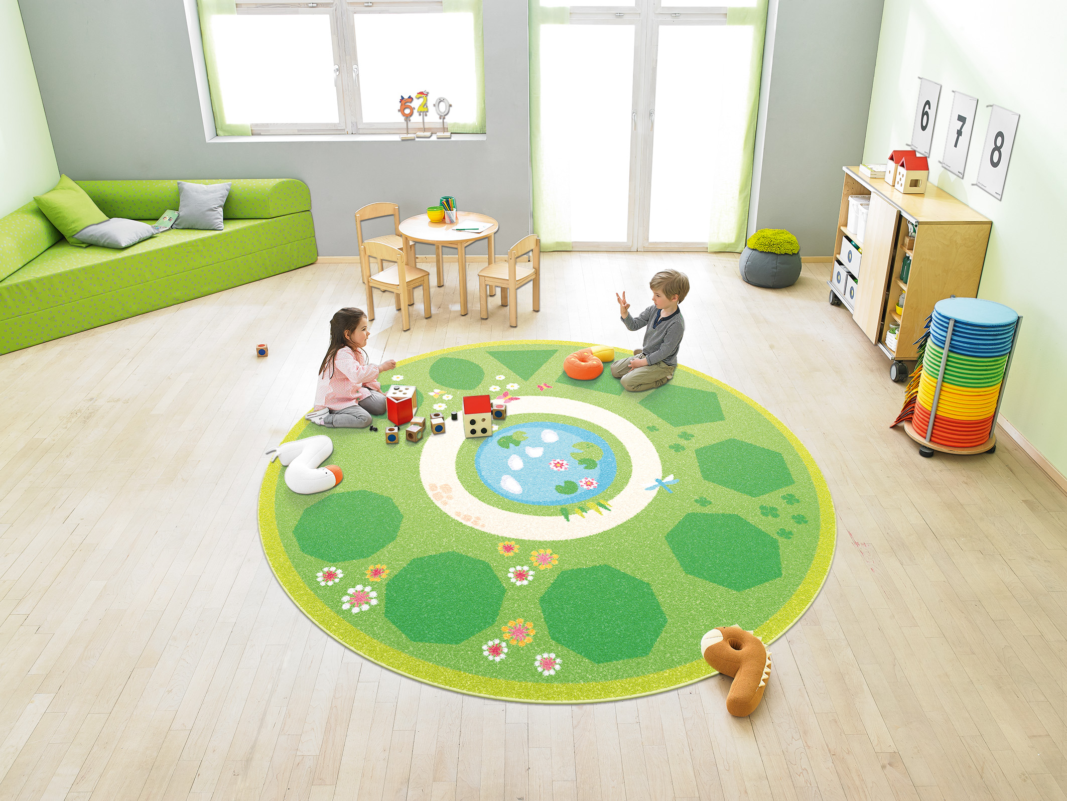 Met zijn geïllustreerde cijfertuinen nodigt het tapijt uit om in de rol van getallen te stappen, plaats te nemen of de cijfertuinen te vullen met objecten die bij het cijfer passen.