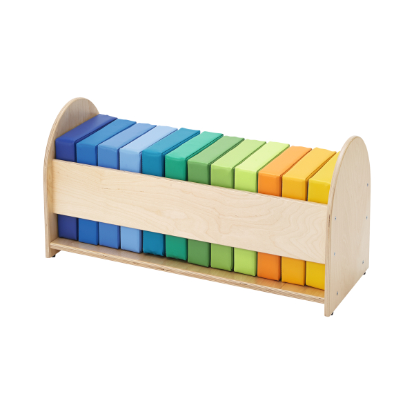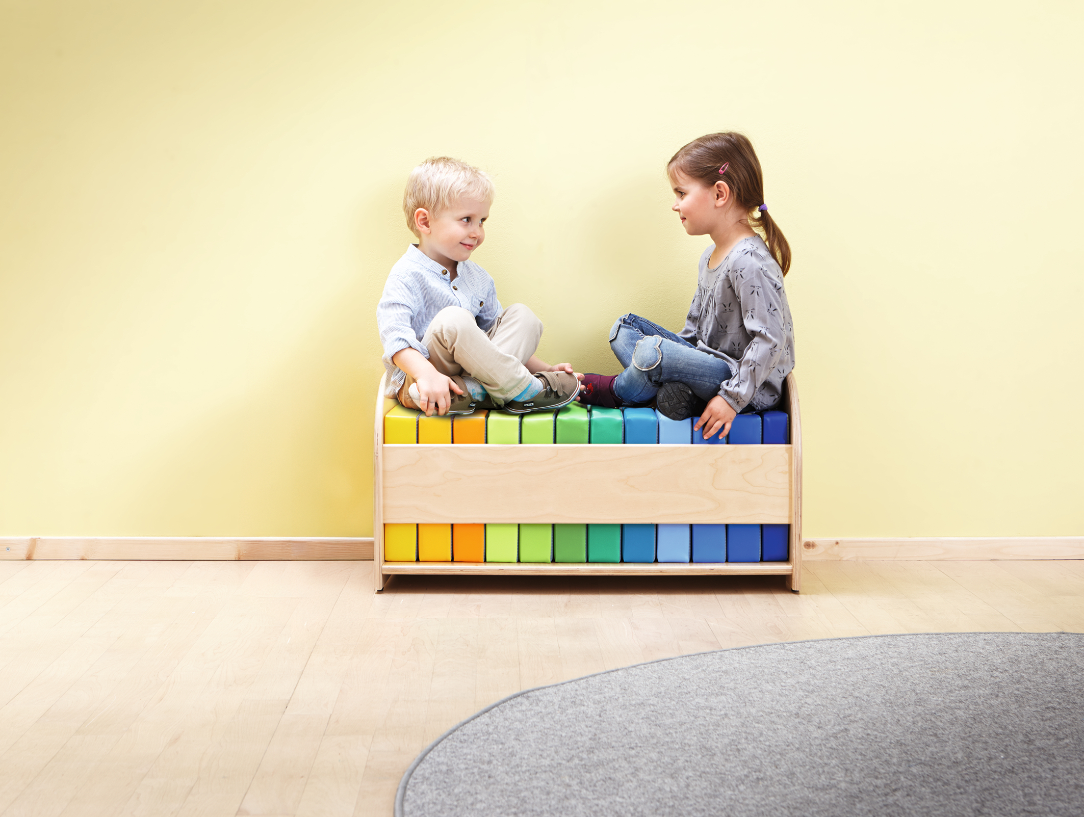 Wanneer de 12 kussens zijn ingestopt, is het resultaat een gestoffeerde zitplaats. Op zichzelf bieden ze 12 kleurrijke zitplaatsen - waar ze ook nodig zijn. Materiaal: Bank van echt houtfineer, kussens van schuimrubber met afneembare hoes van kunstleer, onderkant: antislipmateriaal.